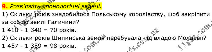 Розв'яжіть хронологічні задачі. 1) Скільки років знадобилося Польському королівству, щоб закріпити за собою землі Галичини? 1 410 - 1 340 = 70 років. 2) Скільки років Шипинська земля перебувала під владою Молдавії? 1 457 - 1 359 = 98 років.
