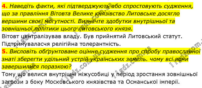 4. Наведіть факти, які підтверджують або спростовують судження, що за правління Вітовта Велике князівство Литовське досягло вершини своєї могутності. Визначте здобутки внутрішньої та зовнішньої політики цього литовського князя. Вітовт централізував владу. Був прийнятий Литовський статут. Підтримувалася релігійна толерантність. 5. Висловіть обґрунтоване оцінне судження про спробу православної знаті зберегти удільний устрій українських земель. чому всі вони завершилися поразкою? Тому що велися внутрішні міжусобиці у період зростання зовнішньої загрози з боку Московського князівства та Османської імперії.