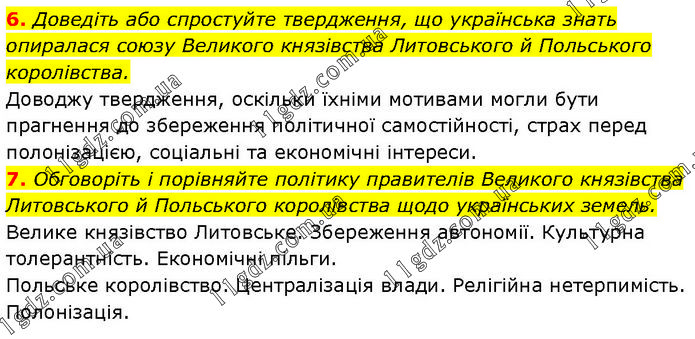 6. Доведіть або спростуйте твердження, що українська знать опиралася союзу Великого князівства Литовського й Польського королівства. Доводжу твердження, оскільки їхніми мотивами могли бути прагнення до збереження політичної самостійності, страх перед полонізацією, соціальні та економічні інтереси. 7. Обговоріть і порівняйте політику правителів Великого князівства Литовського й Польського королівства щодо українських земель. Велике князівство Литовське. Збереження автономії. Культурна толерантність. Економічні пільги. Польське королівство. Централізація влади. Релігійна нетерпимість. Полонізація.
