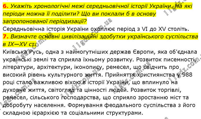6. Укажіть хронологічні межі середньовічної історії України. На які періоди можна її поділити? Що ви поклали б в основу запропонованої періодизації? Середньовічна історія України охоплює період з VI до XV століть. 7. Визначте основні цивілізаційні здобутки українського суспільства в ІХ—XV ст. Київська Русь, одна з наймогутніших держав Європи, яка об'єднала українські землі та сприяла їхньому розвитку. Розвиток писемності, літератури, архітектури, іконопису, ремесел, що свідчить про високий рівень культурного життя. Прийняття християнства у 988 році стало важливою віхою в історії України, що вплинуло на духовне життя, світогляд та цінності людей. Розвиток торгівлі, ремесел, сільського господарства, що сприяло зростанню міст та добробуту населення. Формування феодального суспільства з його складною ієрархією та соціальними структурами.