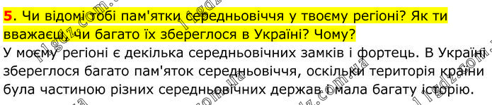 Чи відомі тобі пам'ятки середньовіччя у твоєму регіоні? Як ти вважаєш, чи багато їх збереглося в Україні? Чому? У моєму регіоні є декілька середньовічних замків і фортець. В Україні збереглося багато пам'яток середньовіччя, оскільки територія країни була частиною різних середньовічних держав і мала багату історію.