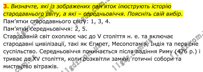 Визначте, які із зображених пам’яток ілюструють історію стародавнього світу, а які – середньовіччя. Поясніть свій вибір. Пам’ятки стародавнього світу: 1, 3, 4. Пам’ятки середньовіччя: 2, 5. Стародавній світ охоплює час до V століття н. е. та включає стародавні цивілізації, такі як Єгипет, Месопотамія, Індія та первісне суспільство. Середньовіччя починається після падіння Риму (476 р.) і триває до XV століття, коли розквітли замки, готичні собори та мистецтво вітражів.