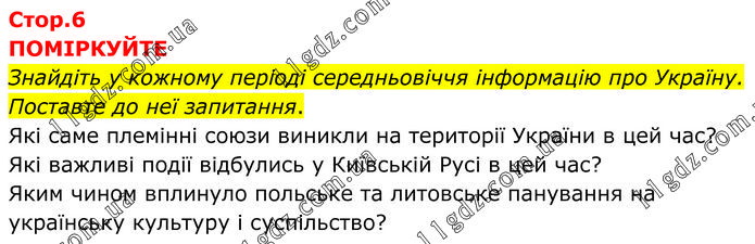 ПОМІРКУЙТЕ Знайдіть у кожному періоді середньовіччя інформацію про Україну. Поставте до неї запитання. Які саме племінні союзи виникли на території України в цей час? Які важливі події відбулись у Київській Русі в цей час? Яким чином вплинуло польське та литовське панування на українську культуру і суспільство?