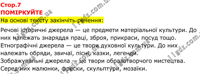 ПОМІРКУЙТЕ На основі тексту закінчіть речення: Речові історичні джерела — це предмети матеріальної культури. До них належать знаряддя праці, зброя, прикраси, посуд тощо. Етнографічні джерела — це твори духовної культури. До них належать обряди, звичаї, пісні, казки, легенди. Зображувальні джерела — це твори образотворчого мистецтва. Серед них малюнки, фрески, скульптури, мозаїки.