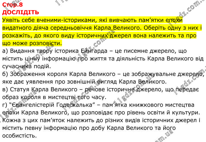 ДОСЛІДІТЬ Уявіть себе вченими-істориками, які вивчають пам’ятки епохи видатного діяча середньовіччя Карла Великого. Оберіть одну з них і розкажіть, до якого виду історичних джерел вона належить та про що може розповісти. а) Видання твору історика Ейнгарда – це писемне джерело, що містить цінну інформацію про життя та діяльність Карла Великого від сучасника подій. б) Зображення короля Карла Великого – це зображувальне джерело, яке дає уявлення про зовнішній вигляд Карла Великого. в) Статуя Карла Великого – речове історичне джерело, що передає образ короля в мистецтві того часу. г) “Євангелістерій Годескалька” – пам’ятка книжкового мистецтва епохи Карла Великого, що розповідає про рівень освіти й культури. Кожна з цих пам’яток належить до різних видів історичних джерел і містить певну інформацію про добу Карла Великого та його особистість.