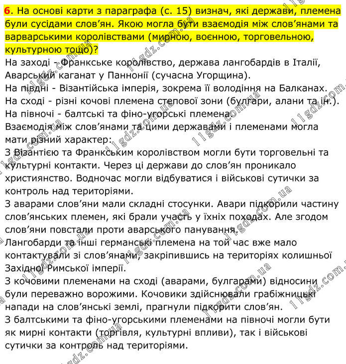 На основі карти з параграфа (с. 15) визнач, які держави, племена були сусідами слов’ян. Якою могла бути взаємодія між слов’янами та варварськими королівствами (мирною, воєнною, торговельною, культурною тощо)? На заході - Франкське королівство, держава лангобардів в Італії, Аварський каганат у Паннонії (сучасна Угорщина). На півдні - Візантійська імперія, зокрема її володіння на Балканах. На сході - різні кочові племена степової зони (булгари, алани та ін.). На півночі - балтські та фіно-угорські племена. Взаємодія між слов’янами та цими державами і племенами могла мати різний характер: З Візантією та Франкським королівством могли бути торговельні та культурні контакти. Через ці держави до слов’ян проникало християнство. Водночас могли відбуватися і військові сутички за контроль над територіями. З аварами слов’яни мали складні стосунки. Авари підкорили частину слов’янських племен, які брали участь у їхніх походах. Але згодом слов’яни повстали проти аварського панування. Лангобарди та інші германські племена на той час вже мало контактували зі слов’янами, закріпившись на територіях колишньої Західної Римської імперії. З кочовими племенами на сході (аварами, булгарами) відносини були переважно ворожими. Кочовики здійснювали грабіжницькі напади на слов’янські землі, прагнули підкорити слов’ян. З балтськими та фіно-угорськими племенами на півночі могли бути як мирні контакти (торгівля, культурні впливи), так і військові сутички за контроль над територіями.