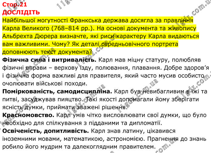 ДОСЛІДІТЬ Найбільшої могутності Франкська держава досягла за правління Карла Великого (768–814 рр.). На основі документа та живопису Альбрехта Дюрера визначте, які риси характеру Карла видаються вам важливими. Чому? Як деталі середньовічного портрета доповнюють текст документа? Фізична сила і витривалість. Карл мав міцну статуру, полюбляв фізичні вправи – верхову їзду, полювання, плавання. Добре здоров’я і фізична форма важливі для правителя, який часто мусив особисто очолювати військові походи. Поміркованість, самодисципліна. Карл був невибагливим в їжі та питві, засуджував пияцтво. Такі якості допомагали йому зберігати ясність думки, приймати зважені рішення. Красномовство. Карл умів чітко висловлювати свої думки, що було необхідно для спілкування з підданими та дипломатії. Освіченість, допитливість. Карл знав латину, цікавився іноземними мовами, математикою, астрономією. Прагнення до знань робило його мудрим та далекоглядним правителем.