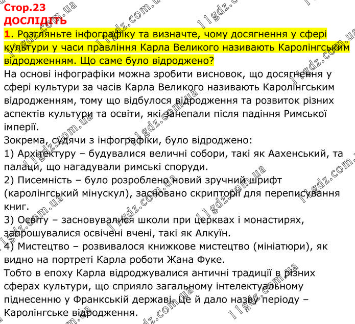 ДОСЛІДІТЬ 1. Розгляньте інфографіку та визначте, чому досягнення у сфері культури у часи правління Карла Великого називають Каролінгським відродженням. Що саме було відроджено? На основі інфографіки можна зробити висновок, що досягнення у сфері культури за часів Карла Великого називають Каролінгським відродженням, тому що відбулося відродження та розвиток різних аспектів культури та освіти, які занепали після падіння Римської імперії. Зокрема, судячи з інфографіки, було відроджено: 1) Архітектуру – будувалися величні собори, такі як Аахенський, та палаци, що нагадували римські споруди. 2) Писемність – було розроблено новий зручний шрифт (каролінгський мінускул), засновано скрипторії для переписування книг. 3) Освіту – засновувалися школи при церквах і монастирях, запрошувалися освічені вчені, такі як Алкуїн. 4) Мистецтво – розвивалося книжкове мистецтво (мініатюри), як видно на портреті Карла роботи Жана Фуке. Тобто в епоху Карла відроджувалися античні традиції в різних сферах культури, що сприяло загальному інтелектуальному піднесенню у Франкській державі. Це й дало назву періоду – Каролінгське відродження.
