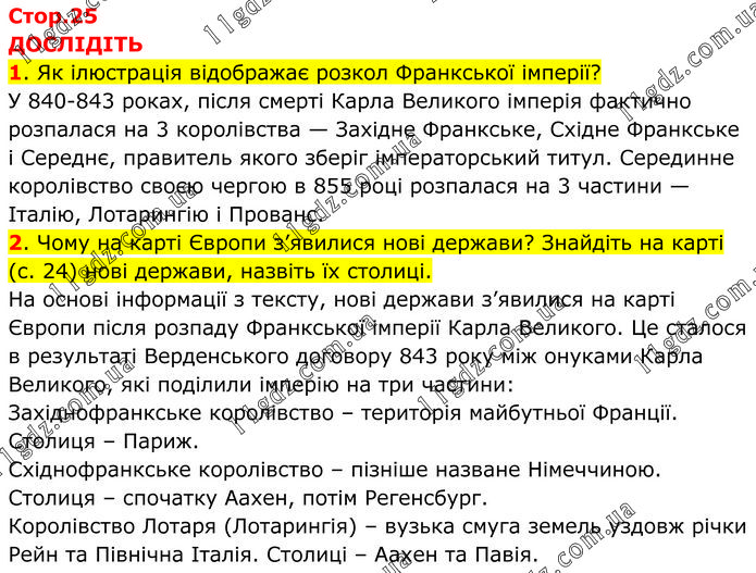ДОСЛІДІТЬ 1. Як ілюстрація відображає розкол Франкської імперії? У 840-843 роках, після смерті Карла Великого імперія фактично розпалася на 3 королівства — Західне Франкське, Східне Франкське і Середнє, правитель якого зберіг імператорський титул. Серединне королівство своєю чергою в 855 році розпалася на 3 частини — Італію, Лотарингію і Прованс. 2. Чому на карті Європи з’явилися нові держави? Знайдіть на карті (с. 24) нові держави, назвіть їх столиці. На основі інформації з тексту, нові держави з’явилися на карті Європи після розпаду Франкської імперії Карла Великого. Це сталося в результаті Верденського договору 843 року між онуками Карла Великого, які поділили імперію на три частини: Західнофранкське королівство – територія майбутньої Франції. Столиця – Париж. Східнофранкське королівство – пізніше назване Німеччиною. Столиця – спочатку Аахен, потім Регенсбург. Королівство Лотаря (Лотарингія) – вузька смуга земель уздовж річки Рейн та Північна Італія. Столиці – Аахен та Павія.