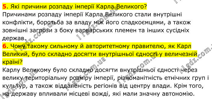 5. Які причини розпаду імперії Карла Великого? Причинами розпаду імперії Карла Великого стали внутрішні конфлікти, боротьба за владу між його спадкоємцями, а також зовнішні загрози з боку варварських племен та інших сусідніх держав. 6. Чому такому сильному й авторитетному правителю, як Карл Великий, було складно досягти внутрішньої єдності у величезній країні? Карлу Великому було складно досягти внутрішньої єдності через велику територіальну розміру імперії, різноманітність етнічних груп і культур, а також віддаленість регіонів від центру влади. Крім того, на державу впливали місцеві вожді, які мали значну автономію.