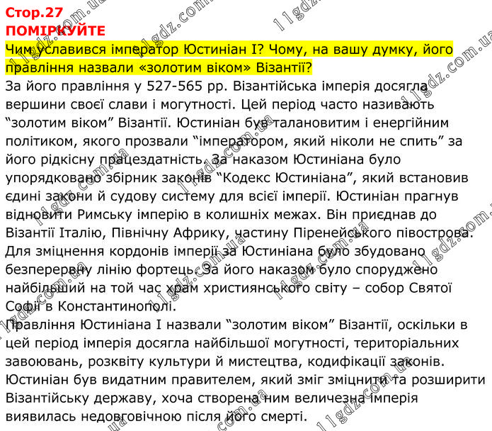 ПОМІРКУЙТЕ Чим уславився імператор Юстиніан І? Чому, на вашу думку, його правління назвали «золотим віком» Візантії? За його правління у 527-565 рр. Візантійська імперія досягла вершини своєї слави і могутності. Цей період часто називають “золотим віком” Візантії. Юстиніан був талановитим і енергійним політиком, якого прозвали “імператором, який ніколи не спить” за його рідкісну працездатність. За наказом Юстиніана було упорядковано збірник законів “Кодекс Юстиніана”, який встановив єдині закони й судову систему для всієї імперії. Юстиніан прагнув відновити Римську імперію в колишніх межах. Він приєднав до Візантії Італію, Північну Африку, частину Піренейського півострова. Для зміцнення кордонів імперії за Юстиніана було збудовано безперервну лінію фортець. За його наказом було споруджено найбільший на той час храм християнського світу – собор Святої Софії в Константинополі. Правління Юстиніана І назвали “золотим віком” Візантії, оскільки в цей період імперія досягла найбільшої могутності, територіальних завоювань, розквіту культури й мистецтва, кодифікації законів. Юстиніан був видатним правителем, який зміг зміцнити та розширити Візантійську державу, хоча створена ним величезна імперія виявилась недовговічною після його смерті.