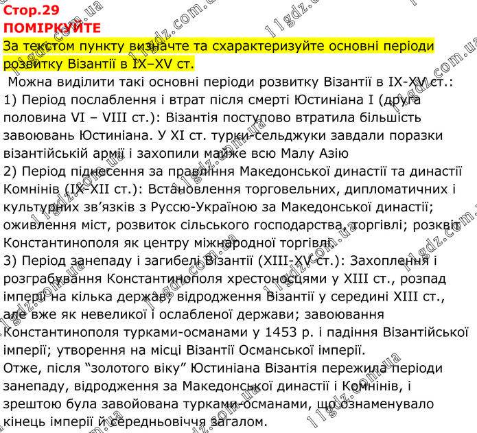 ПОМІРКУЙТЕ За текстом пункту визначте та схарактеризуйте основні періоди розвитку Візантії в ІХ–XV ст. Можна виділити такі основні періоди розвитку Візантії в IX-XV ст.: 1) Період послаблення і втрат після смерті Юстиніана І (друга половина VI – VIII ст.): Візантія поступово втратила більшість завоювань Юстиніана. У XI ст. турки-сельджуки завдали поразки візантійській армії і захопили майже всю Малу Азію 2) Період піднесення за правління Македонської династії та династії Комнінів (IX-XII ст.): Встановлення торговельних, дипломатичних і культурних зв’язків з Руссю-Україною за Македонської династії; оживлення міст, розвиток сільського господарства, торгівлі; розквіт Константинополя як центру міжнародної торгівлі. 3) Період занепаду і загибелі Візантії (XIII-XV ст.): Захоплення і розграбування Константинополя хрестоносцями у XIII ст., розпад імперії на кілька держав; відродження Візантії у середині XIII ст., але вже як невеликої і ослабленої держави; завоювання Константинополя турками-османами у 1453 р. і падіння Візантійської імперії; утворення на місці Візантії Османської імперії. Отже, після “золотого віку” Юстиніана Візантія пережила періоди занепаду, відродження за Македонської династії і Комнінів, і зрештою була завойована турками-османами, що ознаменувало кінець імперії й середньовіччя загалом.