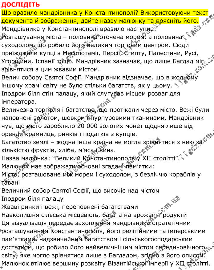 ДОСЛІДІТЬ Що вразило мандрівника у Константинополі? Використовуючи текст документа й зображення, дайте назву малюнку та поясніть його. Мандрівника у Константинополі вразило наступне: Розташування міста – половина оточена морем, а половина суходолом, що робило його великим торговим центром. Сюди приїжджали купці з Месопотамії, Персії, Єгипту, Палестини, Русі, Угорщини, Іспанії тощо. Мандрівник зазначає, що лише Багдад міг зрівнятися з цим жвавим містом. Велич собору Святої Софії. Мандрівник відзначає, що в жодному іншому храмі світу не було стільки багатств, як у цьому. Іподром біля стін палацу, який слугував місцем розваг для імператора. Величезна торгівля і багатство, що протікали через місто. Вежі були наповнені золотом, шовком і пурпуровими тканинами. Мандрівник чув, що місто заробляло 20 000 золотих монет щодня лише від оренди крамниць, ринків і податків з купців. Багатство землі – жодна інша країна не могла зрівнятися з нею за кількістю фруктів, хліба, м’яса і вина. Назва малюнка: “Великий Константинополь у XII столітті”. Малюнок має зображати основні згадані пам’ятки: Місто, розташоване між морем і суходолом, з безліччю кораблів у гавані Величний собор Святої Софії, що височіє над містом Іподром біля палацу Жваві ринки і вежі, переповнені багатствами Навколишня сільська місцевість, багата на врожаї і продукти Ця візуалізація передає захоплення мандрівника стратегічним розташуванням Константинополя, його релігійними та імперськими пам’ятками, надзвичайним багатством і сільськогосподарським достатком, що робило його найвеличнішим містом середньовічного світу, яке могло зрівнятися лише з Багдадом, згідно з його описом. Малюнок втілює вершину розквіту Візантійської імперії у XII столітті.