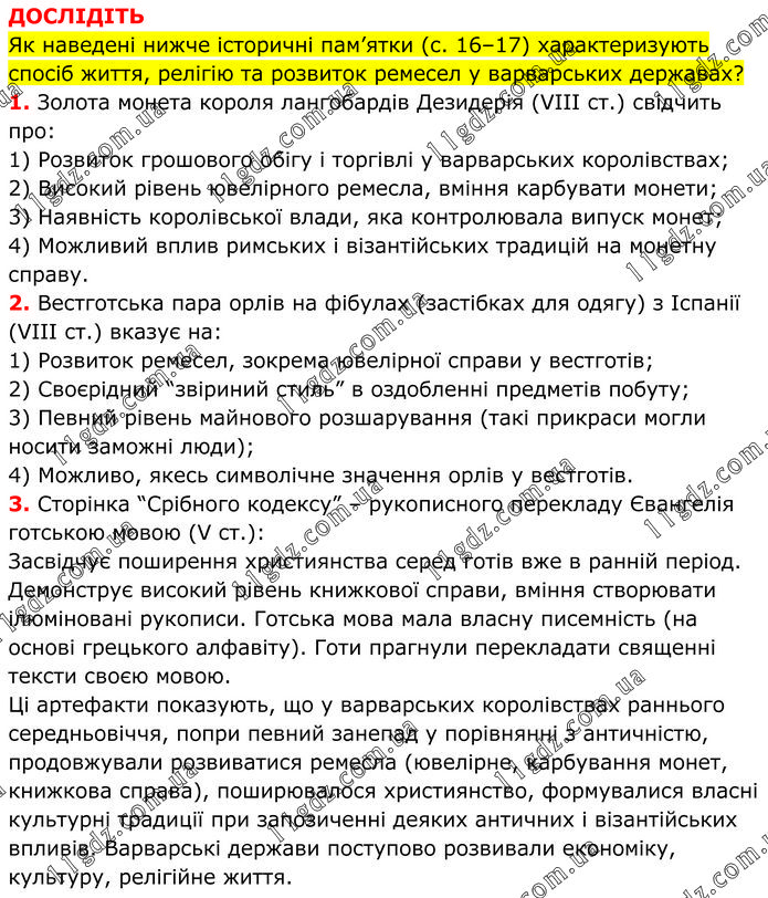 ДОСЛІДІТЬ Як наведені нижче історичні пам’ятки (с. 16–17) характеризують спосіб життя, релігію та розвиток ремесел у варварських державах? 1. Золота монета короля лангобардів Дезидерія (VIII ст.) свідчить про: 1) Розвиток грошового обігу і торгівлі у варварських королівствах; 2) Високий рівень ювелірного ремесла, вміння карбувати монети; 3) Наявність королівської влади, яка контролювала випуск монет; 4) Можливий вплив римських і візантійських традицій на монетну справу. 2. Вестготська пара орлів на фібулах (застібках для одягу) з Іспанії (VIII ст.) вказує на: 1) Розвиток ремесел, зокрема ювелірної справи у вестготів; 2) Своєрідний “звіриний стиль” в оздобленні предметів побуту; 3) Певний рівень майнового розшарування (такі прикраси могли носити заможні люди); 4) Можливо, якесь символічне значення орлів у вестготів. 3. Сторінка “Срібного кодексу” – рукописного перекладу Євангелія готською мовою (V ст.): Засвідчує поширення християнства серед готів вже в ранній період. Демонструє високий рівень книжкової справи, вміння створювати ілюміновані рукописи. Готська мова мала власну писемність (на основі грецького алфавіту). Готи прагнули перекладати священні тексти своєю мовою. Ці артефакти показують, що у варварських королівствах раннього середньовіччя, попри певний занепад у порівнянні з античністю, продовжували розвиватися ремесла (ювелірне, карбування монет, книжкова справа), поширювалося християнство, формувалися власні культурні традиції при запозиченні деяких античних і візантійських впливів. Варварські держави поступово розвивали економіку, культуру, релігійне життя.