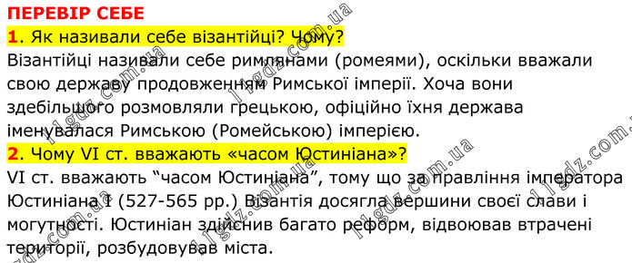 ПЕРЕВІР СЕБЕ 1. Як називали себе візантійці? Чому? Візантійці називали себе римлянами (ромеями), оскільки вважали свою державу продовженням Римської імперії. Хоча вони здебільшого розмовляли грецькою, офіційно їхня держава іменувалася Римською (Ромейською) імперією. 2. Чому VI ст. вважають «часом Юстиніана»? VI ст. вважають “часом Юстиніана”, тому що за правління імператора Юстиніана І (527-565 рр.) Візантія досягла вершини своєї слави і могутності. Юстиніан здійснив багато реформ, відвоював втрачені території, розбудовував міста.