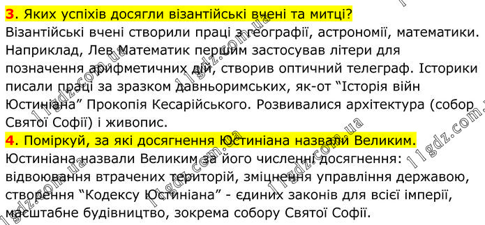 3. Яких успіхів досягли візантійські вчені та митці? Візантійські вчені створили праці з географії, астрономії, математики. Наприклад, Лев Математик першим застосував літери для позначення арифметичних дій, створив оптичний телеграф. Історики писали праці за зразком давньоримських, як-от “Історія війн Юстиніана” Прокопія Кесарійського. Розвивалися архітектура (собор Святої Софії) і живопис. 4. Поміркуй, за які досягнення Юстиніана назвали Великим. Юстиніана назвали Великим за його численні досягнення: відвоювання втрачених територій, зміцнення управління державою, створення “Кодексу Юстиніана” - єдиних законів для всієї імперії, масштабне будівництво, зокрема собору Святої Софії.