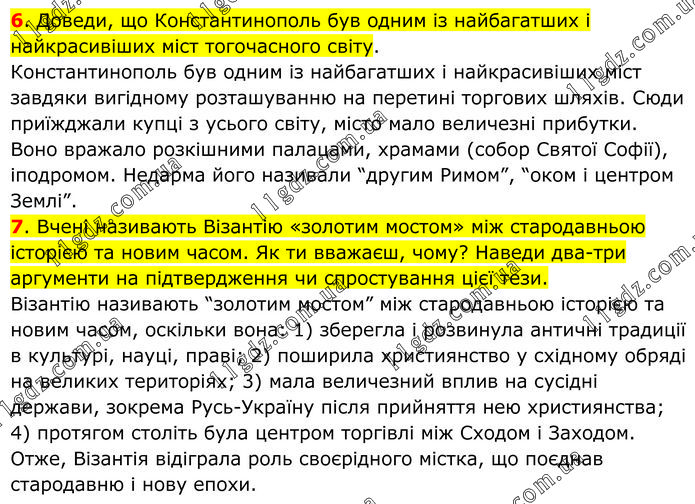 6. Доведи, що Константинополь був одним із найбагатших і найкрасивіших міст тогочасного світу. Константинополь був одним із найбагатших і найкрасивіших міст завдяки вигідному розташуванню на перетині торгових шляхів. Сюди приїжджали купці з усього світу, місто мало величезні прибутки. Воно вражало розкішними палацами, храмами (собор Святої Софії), іподромом. Недарма його називали “другим Римом”, “оком і центром Землі”. 7. Вчені називають Візантію «золотим мостом» між стародавньою історією та новим часом. Як ти вважаєш, чому? Наведи два-три аргументи на підтвердження чи спростування цієї тези. Візантію називають “золотим мостом” між стародавньою історією та новим часом, оскільки вона: 1) зберегла і розвинула античні традиції в культурі, науці, праві; 2) поширила християнство у східному обряді на великих територіях; 3) мала величезний вплив на сусідні держави, зокрема Русь-Україну після прийняття нею християнства; 4) протягом століть була центром торгівлі між Сходом і Заходом. Отже, Візантія відіграла роль своєрідного містка, що поєднав стародавню і нову епохи.