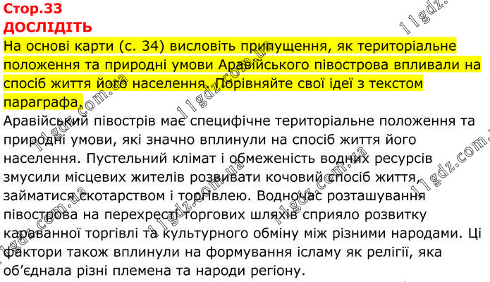 ДОСЛІДІТЬ На основі карти (с. 34) висловіть припущення, як територіальне положення та природні умови Аравійського півострова впливали на спосіб життя його населення. Порівняйте свої ідеї з текстом параграфа. Аравійський півострів має специфічне територіальне положення та природні умови, які значно вплинули на спосіб життя його населення. Пустельний клімат і обмеженість водних ресурсів змусили місцевих жителів розвивати кочовий спосіб життя, займатися скотарством і торгівлею. Водночас розташування півострова на перехресті торгових шляхів сприяло розвитку караванної торгівлі та культурного обміну між різними народами. Ці фактори також вплинули на формування ісламу як релігії, яка об’єднала різні племена та народи регіону.