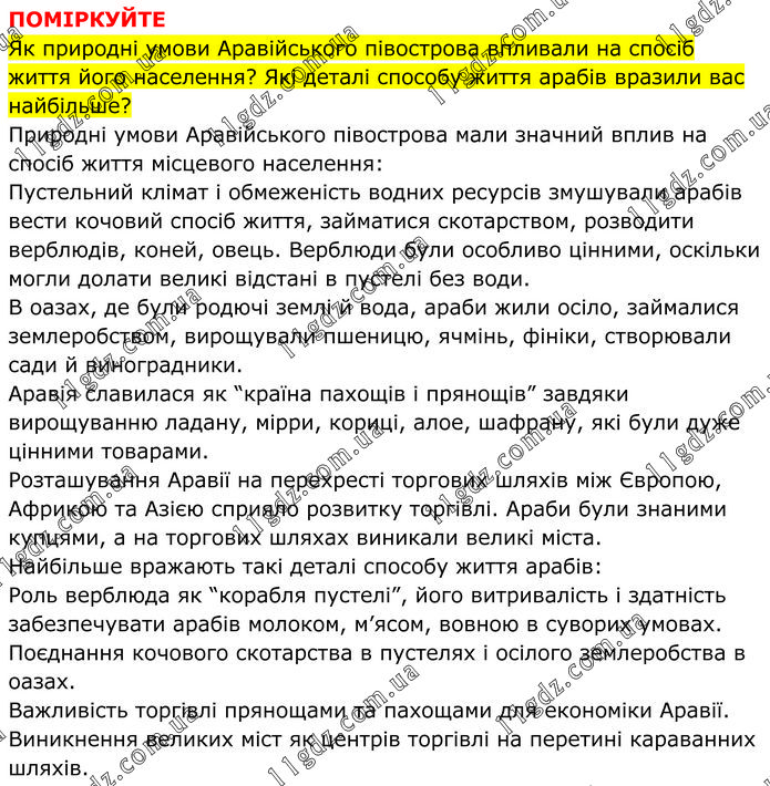 ПОМІРКУЙТЕ Як природні умови Аравійського півострова впливали на спосіб життя його населення? Які деталі способу життя арабів вразили вас найбільше? Природні умови Аравійського півострова мали значний вплив на спосіб життя місцевого населення: Пустельний клімат і обмеженість водних ресурсів змушували арабів вести кочовий спосіб життя, займатися скотарством, розводити верблюдів, коней, овець. Верблюди були особливо цінними, оскільки могли долати великі відстані в пустелі без води. В оазах, де були родючі землі й вода, араби жили осіло, займалися землеробством, вирощували пшеницю, ячмінь, фініки, створювали сади й виноградники. Аравія славилася як “країна пахощів і прянощів” завдяки вирощуванню ладану, мірри, кориці, алое, шафрану, які були дуже цінними товарами. Розташування Аравії на перехресті торгових шляхів між Європою, Африкою та Азією сприяло розвитку торгівлі. Араби були знаними купцями, а на торгових шляхах виникали великі міста. Найбільше вражають такі деталі способу життя арабів: Роль верблюда як “корабля пустелі”, його витривалість і здатність забезпечувати арабів молоком, м’ясом, вовною в суворих умовах. Поєднання кочового скотарства в пустелях і осілого землеробства в оазах. Важливість торгівлі прянощами та пахощами для економіки Аравії. Виникнення великих міст як центрів торгівлі на перетині караванних шляхів.