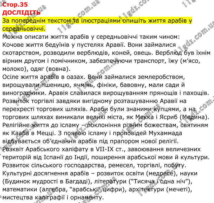 ДОСЛІДІТЬ За попереднім текстом та ілюстраціями опишіть життя арабів у середньовіччі. Можна описати життя арабів у середньовіччі таким чином: Кочове життя бедуїнів у пустелях Аравії. Вони займалися скотарством, розводили верблюдів, коней, овець. Верблюд був їхнім вірним другом і помічником, забезпечуючи транспорт, їжу (м’ясо, молоко), одяг (вовна). Осіле життя арабів в оазах. Вони займалися землеробством, вирощували пшеницю, ячмінь, фініки, бавовну, мали сади й виноградники. Аравія славилася вирощуванням прянощів і пахощів. Розвиток торгівлі завдяки вигідному розташуванню Аравії на перехресті торгових шляхів. Араби були знаними купцями, а на торгових шляхах виникали великі міста, як Мекка і Ясриб (Медина). Релігійне життя до ісламу – поклоніння різним божествам, святиням як Кааба в Мецці. З появою ісламу і проповідей Мухаммада відбувається об’єднання арабів під прапором нової релігії. Розквіт Арабського халіфату в VII-IX ст., завоювання величезних територій від Іспанії до Індії, поширення арабської мови й культури. Розвиток сільського господарства, ремесел, торгівлі, побуту. Культурні досягнення арабів – розвиток освіти (медресе), науки (Будинок мудрості в Багдаді), літератури (“Тисяча і одна ніч”), математики (алгебра, “арабські” цифри), архітектури (мечеті), мистецтва каліграфії і орнаменту.