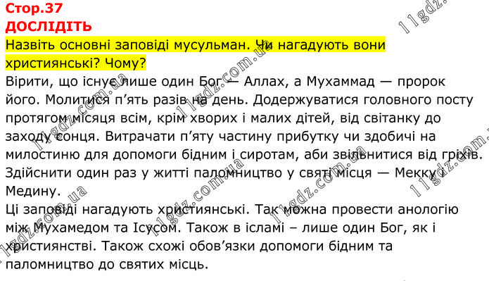 ДОСЛІДІТЬ Назвіть основні заповіді мусульман. Чи нагадують вони християнські? Чому? Вірити, що існує лише один Бог — Аллах, а Мухаммад — пророк його. Молитися п’ять разів на день. Додержуватися головного посту протягом місяця всім, крім хворих і малих дітей, від світанку до заходу сонця. Витрачати п’яту частину прибутку чи здобичі на милостиню для допомоги бідним і сиротам, аби звільнитися від гріхів. Здійснити один раз у житті паломництво у святі місця — Мекку і Медину. Ці заповіді нагадують християнські. Так можна провести анологію між Мухамедом та Ісусом. Також в ісламі – лише один Бог, як і християнстві. Також схожі обов’язки допомоги бідним та паломництво до святих місць.