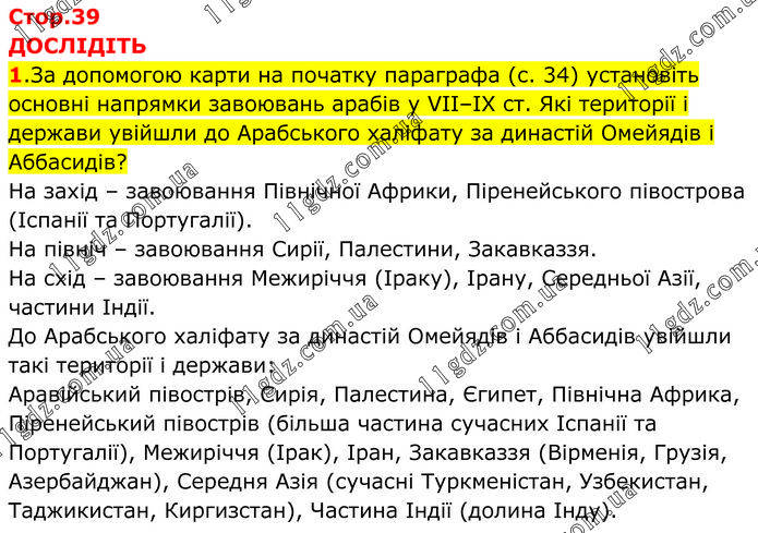 ДОСЛІДІТЬ 1.За допомогою карти на початку параграфа (с. 34) установіть основні напрямки завоювань арабів у VIІ–ІХ ст. Які території і держави увійшли до Арабського халіфату за династій Омейядів і Аббасидів? На захід – завоювання Північної Африки, Піренейського півострова (Іспанії та Португалії). На північ – завоювання Сирії, Палестини, Закавказзя. На схід – завоювання Межиріччя (Іраку), Ірану, Середньої Азії, частини Індії. До Арабського халіфату за династій Омейядів і Аббасидів увійшли такі території і держави: Аравійський півострів, Сирія, Палестина, Єгипет, Північна Африка, Піренейський півострів (більша частина сучасних Іспанії та Португалії), Межиріччя (Ірак), Іран, Закавказзя (Вірменія, Грузія, Азербайджан), Середня Азія (сучасні Туркменістан, Узбекистан, Таджикистан, Киргизстан), Частина Індії (долина Інду).