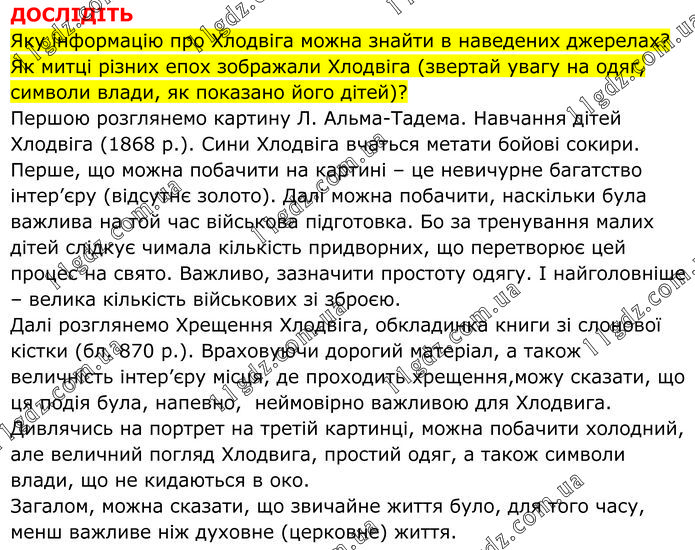 ДОСЛІДІТЬ Яку інформацію про Хлодвіга можна знайти в наведених джерелах? Як митці різних епох зображали Хлодвіга (звертай увагу на одяг, символи влади, як показано його дітей)? Першою розглянемо картину Л. Альма-Тадема. Навчання дітей Хлодвіга (1868 р.). Сини Хлодвіга вчаться метати бойові сокири. Перше, що можна побачити на картині – це невичурне багатство інтер’єру (відсутнє золото). Далі можна побачити, наскільки була важлива на той час військова підготовка. Бо за тренування малих дітей слідкує чимала кількість придворних, що перетворює цей процес на свято. Важливо, зазначити простоту одягу. І найголовніше – велика кількість військових зі зброєю. Далі розглянемо Хрещення Хлодвіга, обкладинка книги зі слонової кістки (бл. 870 р.). Враховуючи дорогий матеріал, а також величність інтер’єру місця, де проходить хрещення,можу сказати, що ця подія була, напевно, неймовірно важливою для Хлодвига. Дивлячись на портрет на третій картинці, можна побачити холодний, але величний погляд Хлодвига, простий одяг, а також символи влади, що не кидаються в око. Загалом, можна сказати, що звичайне життя було, для того часу, менш важливе ніж духовне (церковне) життя.