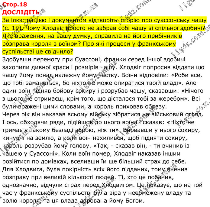 ДОСЛІДІТЬ За ілюстрацією і документом відтворіть історію про суассонську чашу (с. 19). Чому Хлодвіг просто не забрав собі чашу зі спільної здобичі? Яке враження, на вашу думку, справила на його прибічників розправа короля з воїном? Про які процеси у франкському суспільстві це свідчило? Здобувши перемогу при Суассоні, франки серед іншої здобичі захопили дивної краси і розмірів чашу. Хлодвіг попросив віддати цю чашу йому понад належну йому частку. Воїни відповіли: «Роби все, що тобі заманеться, бо ніхто не може опиратися твоїй владі». Але один воїн підняв бойову сокиру і розрубав чашу, сказавши: «Нічого з цього не отримаєш, крім того, що дісталося тобі за жеребом». Всі були вражені цими словами, а король приховав образу. Через рік він наказав всьому війську зібратися на військовий огляд. І ось, обходячи ряди, підійшов до цього воїна і сказав: «Ніхто не тримає у такому безладі зброю, ніж ти». Вирвавши у нього сокиру, кинув її на землю, а коли воїн нахилився, щоб підняти сокиру, король розрубав йому голову. «Так, - сказав він, - ти вчинив із чашею у Суассоні». Коли воїн помер, Хлодвіг наказав іншим розійтися по домівках, вселивши їм ще більший страх до себе. Для Хлодвига, була покірність всіх його підданих, тому вченив розправу при великій кількості людей. Ті, хто це побачив, однозначно, відчули страх перед Хлодвигом. Це показує, що на той час у франкському суспільстві була віра у необмежену владу та волю короля, та ця влада дарована йому Богом.