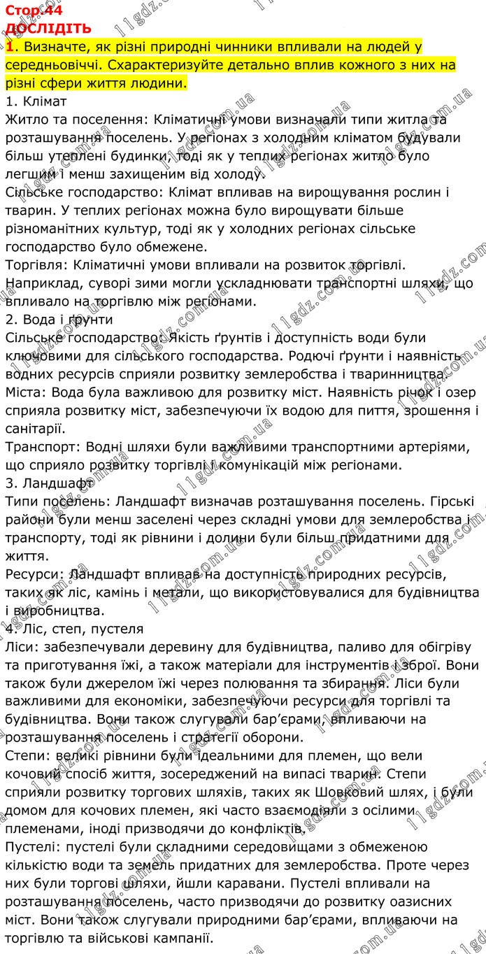 ДОСЛІДІТЬ 1. Визначте, як різні природні чинники впливали на людей у середньовіччі. Схарактеризуйте детально вплив кожного з них на різні сфери життя людини. 1. Клімат Житло та поселення: Кліматичні умови визначали типи житла та розташування поселень. У регіонах з холодним кліматом будували більш утеплені будинки, тоді як у теплих регіонах житло було легшим і менш захищеним від холоду. Сільське господарство: Клімат впливав на вирощування рослин і тварин. У теплих регіонах можна було вирощувати більше різноманітних культур, тоді як у холодних регіонах сільське господарство було обмежене. Торгівля: Кліматичні умови впливали на розвиток торгівлі. Наприклад, суворі зими могли ускладнювати транспортні шляхи, що впливало на торгівлю між регіонами. 2. Вода і ґрунти Сільське господарство: Якість ґрунтів і доступність води були ключовими для сільського господарства. Родючі ґрунти і наявність водних ресурсів сприяли розвитку землеробства і тваринництва. Міста: Вода була важливою для розвитку міст. Наявність річок і озер сприяла розвитку міст, забезпечуючи їх водою для пиття, зрошення і санітарії. Транспорт: Водні шляхи були важливими транспортними артеріями, що сприяло розвитку торгівлі і комунікацій між регіонами. 3. Ландшафт Типи поселень: Ландшафт визначав розташування поселень. Гірські райони були менш заселені через складні умови для землеробства і транспорту, тоді як рівнини і долини були більш придатними для життя. Ресурси: Ландшафт впливав на доступність природних ресурсів, таких як ліс, камінь і метали, що використовувалися для будівництва і виробництва. 4. Ліс, степ, пустеля Ліси: забезпечували деревину для будівництва, паливо для обігріву та приготування їжі, а також матеріали для інструментів і зброї. Вони також були джерелом їжі через полювання та збирання. Ліси були важливими для економіки, забезпечуючи ресурси для торгівлі та будівництва. Вони також слугували бар’єрами, впливаючи на розташування поселень і стратегії оборони. Степи: великі рівнини були ідеальними для племен, що вели кочовий спосіб життя, зосереджений на випасі тварин. Степи сприяли розвитку торгових шляхів, таких як Шовковий шлях, і були домом для кочових племен, які часто взаємодіяли з осілими племенами, іноді призводячи до конфліктів. Пустелі: пустелі були складними середовищами з обмеженою кількістю води та земель придатних для землеробства. Проте через них були торгові шляхи, йшли каравани. Пустелі впливали на розташування поселень, часто призводячи до розвитку оазисних міст. Вони також слугували природними бар’єрами, впливаючи на торгівлю та військові кампанії.