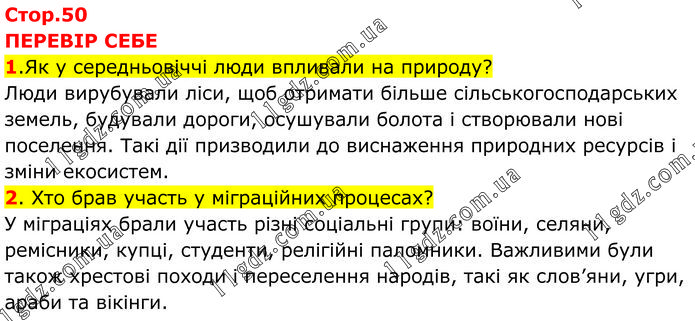 ПЕРЕВІР СЕБЕ 1.Як у середньовіччі люди впливали на природу? Люди вирубували ліси, щоб отримати більше сільськогосподарських земель, будували дороги, осушували болота і створювали нові поселення. Такі дії призводили до виснаження природних ресурсів і зміни екосистем. 2. Хто брав участь у міграційних процесах? У міграціях брали участь різні соціальні групи: воїни, селяни, ремісники, купці, студенти, релігійні паломники. Важливими були також хрестові походи і переселення народів, такі як слов’яни, угри, араби та вікінги.