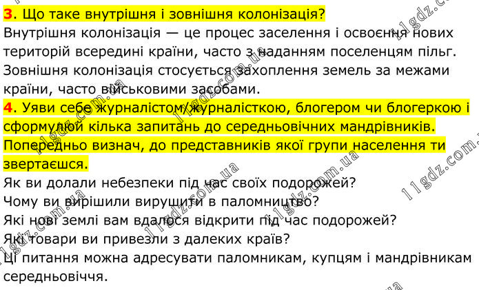 3. Що таке внутрішня і зовнішня колонізація? Внутрішня колонізація — це процес заселення і освоєння нових територій всередині країни, часто з наданням поселенцям пільг. Зовнішня колонізація стосується захоплення земель за межами країни, часто військовими засобами. 4. Уяви себе журналістом/журналісткою, блогером чи блогеркою і сформулюй кілька запитань до середньовічних мандрівників. Попередньо визнач, до представників якої групи населення ти звертаєшся. Як ви долали небезпеки під час своїх подорожей? Чому ви вирішили вирушити в паломництво? Які нові землі вам вдалося відкрити під час подорожей? Які товари ви привезли з далеких країв? Ці питання можна адресувати паломникам, купцям і мандрівникам середньовіччя.