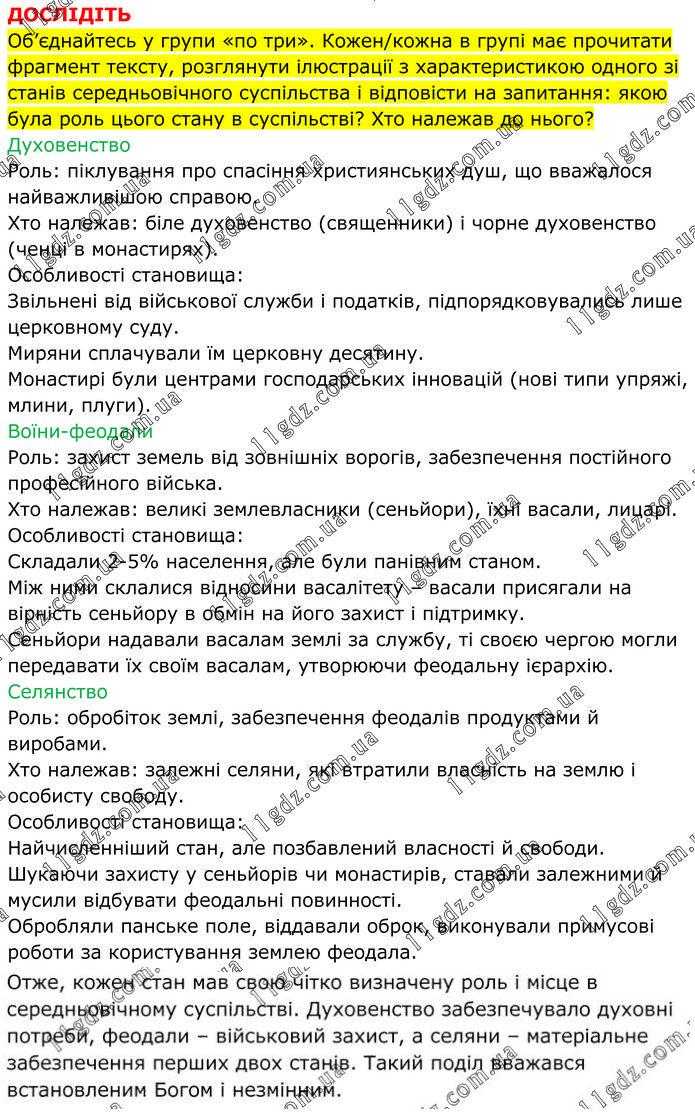 ДОСЛІДІТЬ Об’єднайтесь у групи «по три». Кожен/кожна в групі має прочитати фрагмент тексту, розглянути ілюстрації з характеристикою одного зі станів середньовічного суспільства і відповісти на запитання: якою була роль цього стану в суспільстві? Хто належав до нього? Духовенство Роль: піклування про спасіння християнських душ, що вважалося найважливішою справою. Хто належав: біле духовенство (священники) і чорне духовенство (ченці в монастирях). Особливості становища: Звільнені від військової служби і податків, підпорядковувались лише церковному суду. Миряни сплачували їм церковну десятину. Монастирі були центрами господарських інновацій (нові типи упряжі, млини, плуги). Воїни-феодали Роль: захист земель від зовнішніх ворогів, забезпечення постійного професійного війська. Хто належав: великі землевласники (сеньйори), їхні васали, лицарі. Особливості становища: Складали 2-5% населення, але були панівним станом. Між ними склалися відносини васалітету – васали присягали на вірність сеньйору в обмін на його захист і підтримку. Сеньйори надавали васалам землі за службу, ті своєю чергою могли передавати їх своїм васалам, утворюючи феодальну ієрархію. Селянство Роль: обробіток землі, забезпечення феодалів продуктами й виробами. Хто належав: залежні селяни, які втратили власність на землю і особисту свободу. Особливості становища: Найчисленніший стан, але позбавлений власності й свободи. Шукаючи захисту у сеньйорів чи монастирів, ставали залежними й мусили відбувати феодальні повинності. Обробляли панське поле, віддавали оброк, виконували примусові роботи за користування землею феодала. Отже, кожен стан мав свою чітко визначену роль і місце в середньовічному суспільстві. Духовенство забезпечувало духовні потреби, феодали – військовий захист, а селяни – матеріальне забезпечення перших двох станів. Такий поділ вважався встановленим Богом і незмінним.