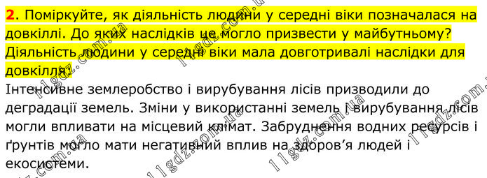 Поміркуйте, як діяльність людини у середні віки позначалася на довкіллі. До яких наслідків це могло призвести у майбутньому? Діяльність людини у середні віки мала довготривалі наслідки для довкілля: Інтенсивне землеробство і вирубування лісів призводили до деградації земель. Зміни у використанні земель і вирубування лісів могли впливати на місцевий клімат. Забруднення водних ресурсів і ґрунтів могло мати негативний вплив на здоров’я людей і екосистеми.