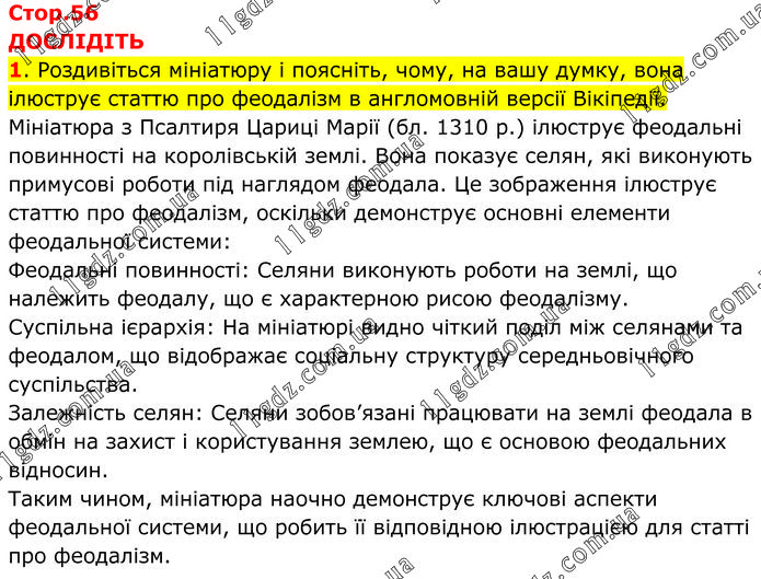 ДОСЛІДІТЬ 1. Роздивіться мініатюру і поясніть, чому, на вашу думку, вона ілюструє статтю про феодалізм в англомовній версії Вікіпедії. Мініатюра з Псалтиря Цариці Марії (бл. 1310 р.) ілюструє феодальні повинності на королівській землі. Вона показує селян, які виконують примусові роботи під наглядом феодала. Це зображення ілюструє статтю про феодалізм, оскільки демонструє основні елементи феодальної системи: Феодальні повинності: Селяни виконують роботи на землі, що належить феодалу, що є характерною рисою феодалізму. Суспільна ієрархія: На мініатюрі видно чіткий поділ між селянами та феодалом, що відображає соціальну структуру середньовічного суспільства. Залежність селян: Селяни зобов’язані працювати на землі феодала в обмін на захист і користування землею, що є основою феодальних відносин. Таким чином, мініатюра наочно демонструє ключові аспекти феодальної системи, що робить її відповідною ілюстрацією для статті про феодалізм.