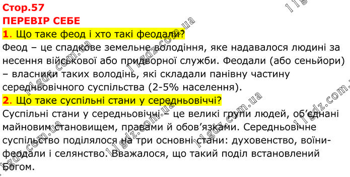 ПЕРЕВІР СЕБЕ 1. Що таке феод і хто такі феодали? Феод – це спадкове земельне володіння, яке надавалося людині за несення військової або придворної служби. Феодали (або сеньйори) – власники таких володінь, які складали панівну частину середньовічного суспільства (2-5% населення). 2. Що таке суспільні стани у середньовіччі? Суспільні стани у середньовіччі – це великі групи людей, об’єднані майновим становищем, правами й обов’язками. Середньовічне суспільство поділялося на три основні стани: духовенство, воїни-феодали і селянство. Вважалося, що такий поділ встановлений Богом.