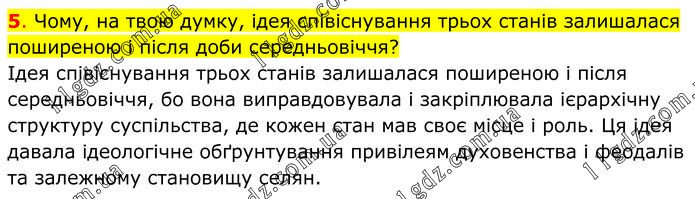 Чому, на твою думку, ідея співіснування трьох станів залишалася поширеною і після доби середньовіччя? Ідея співіснування трьох станів залишалася поширеною і після середньовіччя, бо вона виправдовувала і закріплювала ієрархічну структуру суспільства, де кожен стан мав своє місце і роль. Ця ідея давала ідеологічне обґрунтування привілеям духовенства і феодалів та залежному становищу селян.