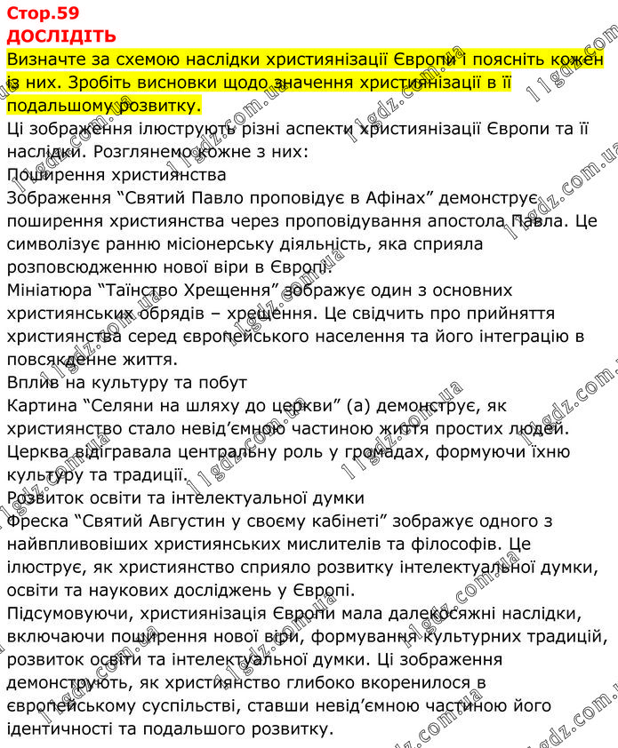 ДОСЛІДІТЬ Визначте за схемою наслідки християнізації Європи і поясніть кожен із них. Зробіть висновки щодо значення християнізації в її подальшому розвитку. Ці зображення ілюструють різні аспекти християнізації Європи та її наслідки. Розглянемо кожне з них: Поширення християнства Зображення “Святий Павло проповідує в Афінах” демонструє поширення християнства через проповідування апостола Павла. Це символізує ранню місіонерську діяльність, яка сприяла розповсюдженню нової віри в Європі. Мініатюра “Таїнство Хрещення” зображує один з основних християнських обрядів – хрещення. Це свідчить про прийняття християнства серед європейського населення та його інтеграцію в повсякденне життя. Вплив на культуру та побут Картина “Селяни на шляху до церкви” (а) демонструє, як християнство стало невід’ємною частиною життя простих людей. Церква відігравала центральну роль у громадах, формуючи їхню культуру та традиції. Розвиток освіти та інтелектуальної думки Фреска “Святий Августин у своєму кабінеті” зображує одного з найвпливовіших християнських мислителів та філософів. Це ілюструє, як християнство сприяло розвитку інтелектуальної думки, освіти та наукових досліджень у Європі. Підсумовуючи, християнізація Європи мала далекосяжні наслідки, включаючи поширення нової віри, формування культурних традицій, розвиток освіти та інтелектуальної думки. Ці зображення демонструють, як християнство глибоко вкоренилося в європейському суспільстві, ставши невід’ємною частиною його ідентичності та подальшого розвитку.