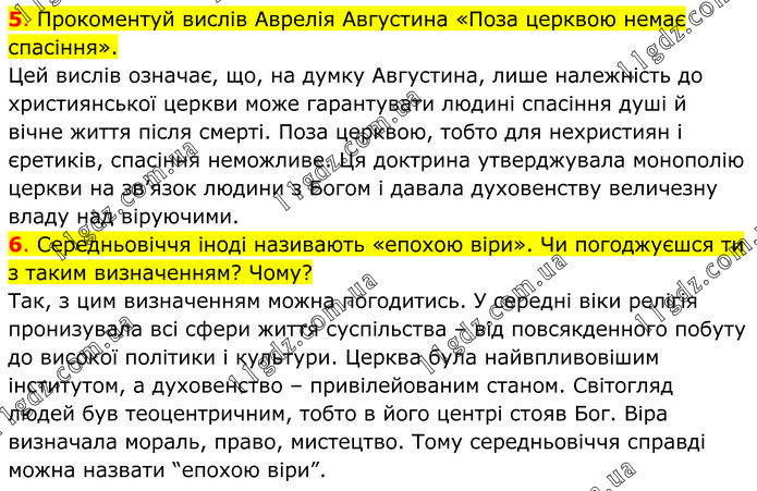 5. Прокоментуй вислів Аврелія Августина «Поза церквою немає спасіння». Цей вислів означає, що, на думку Августина, лише належність до християнської церкви може гарантувати людині спасіння душі й вічне життя після смерті. Поза церквою, тобто для нехристиян і єретиків, спасіння неможливе. Ця доктрина утверджувала монополію церкви на зв’язок людини з Богом і давала духовенству величезну владу над віруючими. 6. Середньовіччя іноді називають «епохою віри». Чи погоджуєшся ти з таким визначенням? Чому? Так, з цим визначенням можна погодитись. У середні віки релігія пронизувала всі сфери життя суспільства – від повсякденного побуту до високої політики і культури. Церква була найвпливовішим інститутом, а духовенство – привілейованим станом. Світогляд людей був теоцентричним, тобто в його центрі стояв Бог. Віра визначала мораль, право, мистецтво. Тому середньовіччя справді можна назвати “епохою віри”.