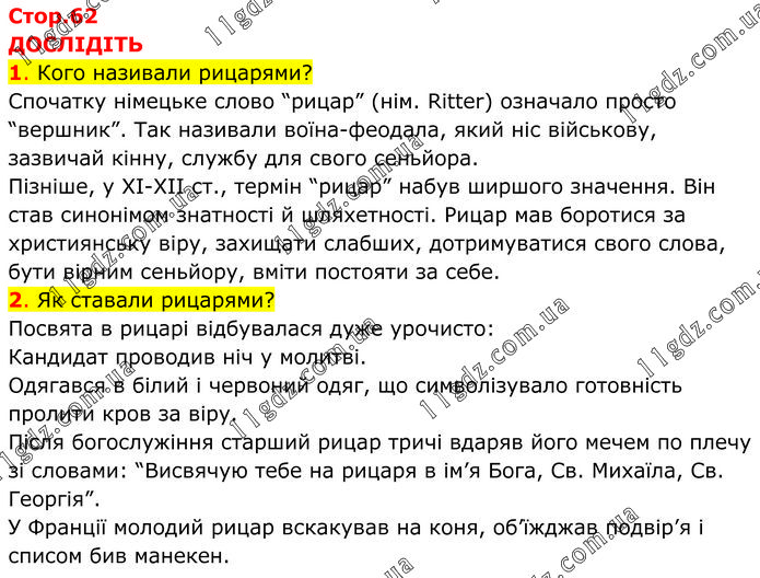 ДОСЛІДІТЬ 1. Кого називали рицарями? Спочатку німецьке слово “рицар” (нім. Ritter) означало просто “вершник”. Так називали воїна-феодала, який ніс військову, зазвичай кінну, службу для свого сеньйора. Пізніше, у XI-XII ст., термін “рицар” набув ширшого значення. Він став синонімом знатності й шляхетності. Рицар мав боротися за християнську віру, захищати слабших, дотримуватися свого слова, бути вірним сеньйору, вміти постояти за себе. 2. Як ставали рицарями? Посвята в рицарі відбувалася дуже урочисто: Кандидат проводив ніч у молитві. Одягався в білий і червоний одяг, що символізувало готовність пролити кров за віру. Після богослужіння старший рицар тричі вдаряв його мечем по плечу зі словами: “Висвячую тебе на рицаря в ім’я Бога, Св. Михаїла, Св. Георгія”. У Франції молодий рицар вскакував на коня, об’їжджав подвір’я і списом бив манекен.