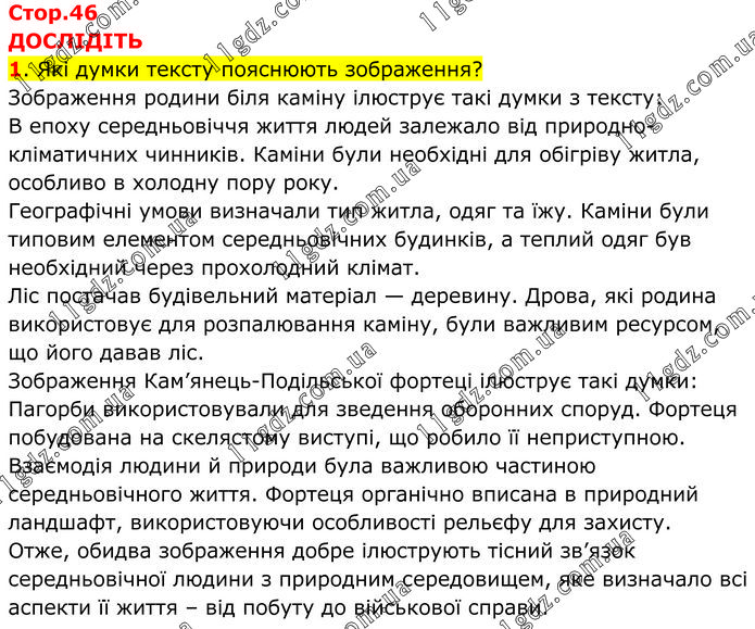 ДОСЛІДІТЬ 1. Які думки тексту пояснюють зображення? Зображення родини біля каміну ілюструє такі думки з тексту: В епоху середньовіччя життя людей залежало від природно-кліматичних чинників. Каміни були необхідні для обігріву житла, особливо в холодну пору року. Географічні умови визначали тип житла, одяг та їжу. Каміни були типовим елементом середньовічних будинків, а теплий одяг був необхідний через прохолодний клімат. Ліс постачав будівельний матеріал — деревину. Дрова, які родина використовує для розпалювання каміну, були важливим ресурсом, що його давав ліс. Зображення Кам’янець-Подільської фортеці ілюструє такі думки: Пагорби використовували для зведення оборонних споруд. Фортеця побудована на скелястому виступі, що робило її неприступною. Взаємодія людини й природи була важливою частиною середньовічного життя. Фортеця органічно вписана в природний ландшафт, використовуючи особливості рельєфу для захисту. Отже, обидва зображення добре ілюструють тісний зв’язок середньовічної людини з природним середовищем, яке визначало всі аспекти її життя – від побуту до військової справи.
