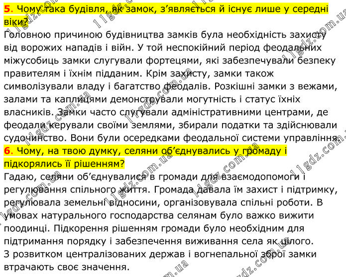5. Чому така будівля, як замок, з’являється й існує лише у середні віки? Головною причиною будівництва замків була необхідність захисту від ворожих нападів і війн. У той неспокійний період феодальних міжусобиць замки слугували фортецями, які забезпечували безпеку правителям і їхнім підданим. Крім захисту, замки також символізували владу і багатство феодалів. Розкішні замки з вежами, залами та каплицями демонстрували могутність і статус їхніх власників. Замки часто слугували адміністративними центрами, де феодали керували своїми землями, збирали податки та здійснювали судочинство. Вони були осередками феодальної системи управління. 6. Чому, на твою думку, селяни об’єднувались у громаду і підкорялись її рішенням? Гадаю, селяни об’єднувалися в громади для взаємодопомоги і регулювання спільного життя. Громада давала їм захист і підтримку, регулювала земельні відносини, організовувала спільні роботи. В умовах натурального господарства селянам було важко вижити поодинці. Підкорення рішенням громади було необхідним для підтримання порядку і забезпечення виживання села як цілого. З розвитком централізованих держав і вогнепальної зброї замки втрачають своє значення.