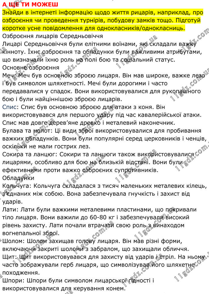 А ЩЕ ТИ МОЖЕШ Знайди в інтернеті інформацію щодо життя рицарів, наприклад, про озброєння чи проведення турнірів, побудову замків тощо. Підготуй коротке усне повідомлення для однокласників/однокласниць. Озброєння лицарів Середньовіччя Лицарі Середньовіччя були елітними воїнами, які складали важку кінноту. Їхнє озброєння та обладунки були важливими атрибутами, що визначали їхню роль на полі бою та соціальний статус. Основне озброєння Меч: Меч був основною зброєю лицаря. Він мав широке, важке лезо і був символом шляхетності. Мечі були дорогими і часто передавалися у спадок. Вони використовувалися для рукопашного бою і були найціннішою зброєю лицарів. Спис: Спис був основною зброєю для атаки з коня. Він використовувався для першого удару під час кавалерійської атаки. Спис мав довге дерев’яне древко і металевий наконечник. Булава та молот: Ці види зброї використовувалися для пробивання важких обладунків. Вони були популярні серед церковників і ченців, оскільки не мали гострих лез. Сокира та ланцюг: Сокири та ланцюги також використовувалися лицарями, особливо для бою на близькій відстані. Вони були ефективними проти важко озброєних супротивників. Обладунки Кольчуга: Кольчуга складалася з тисяч маленьких металевих кілець, з’єднаних між собою. Вона забезпечувала гнучкість і захист від ударів. Лати: Лати були важкими металевими пластинами, що покривали тіло лицаря. Вони важили до 60-80 кг і забезпечували високий рівень захисту. Лати почали втрачати свою роль з винаходом вогнепальної зброї. Шолом: Шолом захищав голову лицаря. Він мав різні форми, включаючи закриті шоломи з забралом, що захищали обличчя. Щит: Щит використовувався для захисту від ударів і стріл. На ньому часто зображували герб лицаря, що символізував його шляхетне походження. Шпори: Шпори були символом лицарської гідності і використовувалися для керування конем.