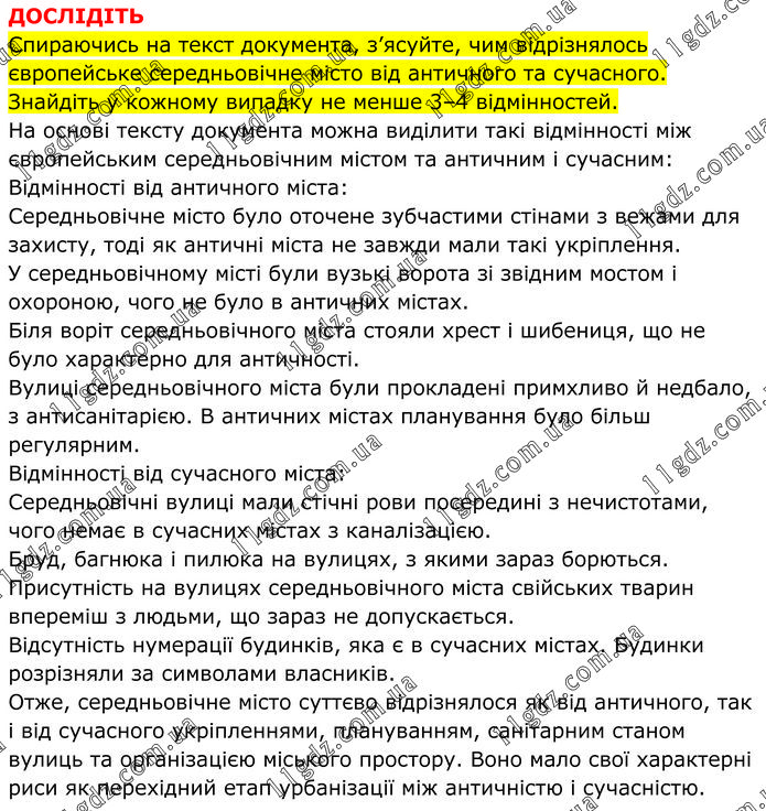 ДОСЛІДІТЬ Спираючись на текст документа, з’ясуйте, чим відрізнялось європейське середньовічне місто від античного та сучасного. Знайдіть у кожному випадку не менше 3–4 відмінностей. На основі тексту документа можна виділити такі відмінності між європейським середньовічним містом та античним і сучасним: Відмінності від античного міста: Середньовічне місто було оточене зубчастими стінами з вежами для захисту, тоді як античні міста не завжди мали такі укріплення. У середньовічному місті були вузькі ворота зі звідним мостом і охороною, чого не було в античних містах. Біля воріт середньовічного міста стояли хрест і шибениця, що не було характерно для античності. Вулиці середньовічного міста були прокладені примхливо й недбало, з антисанітарією. В античних містах планування було більш регулярним. Відмінності від сучасного міста: Середньовічні вулиці мали стічні рови посередині з нечистотами, чого немає в сучасних містах з каналізацією. Бруд, багнюка і пилюка на вулицях, з якими зараз борються. Присутність на вулицях середньовічного міста свійських тварин впереміш з людьми, що зараз не допускається. Відсутність нумерації будинків, яка є в сучасних містах. Будинки розрізняли за символами власників. Отже, середньовічне місто суттєво відрізнялося як від античного, так і від сучасного укріпленнями, плануванням, санітарним станом вулиць та організацією міського простору. Воно мало свої характерні риси як перехідний етап урбанізації між античністю і сучасністю.