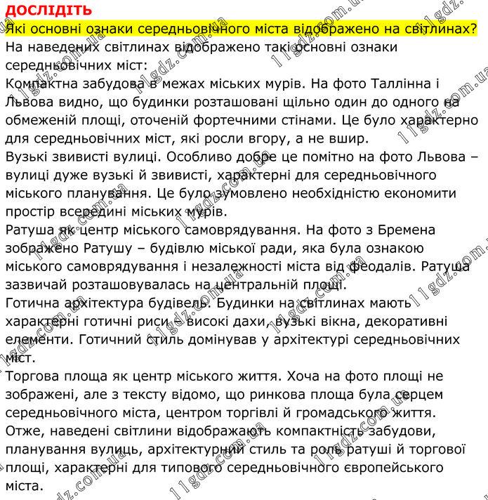 ДОСЛІДІТЬ Які основні ознаки середньовічного міста відображено на світлинах? На наведених світлинах відображено такі основні ознаки середньовічних міст: Компактна забудова в межах міських мурів. На фото Таллінна і Львова видно, що будинки розташовані щільно один до одного на обмеженій площі, оточеній фортечними стінами. Це було характерно для середньовічних міст, які росли вгору, а не вшир. Вузькі звивисті вулиці. Особливо добре це помітно на фото Львова – вулиці дуже вузькі й звивисті, характерні для середньовічного міського планування. Це було зумовлено необхідністю економити простір всередині міських мурів. Ратуша як центр міського самоврядування. На фото з Бремена зображено Ратушу – будівлю міської ради, яка була ознакою міського самоврядування і незалежності міста від феодалів. Ратуша зазвичай розташовувалась на центральній площі. Готична архітектура будівель. Будинки на світлинах мають характерні готичні риси – високі дахи, вузькі вікна, декоративні елементи. Готичний стиль домінував у архітектурі середньовічних міст. Торгова площа як центр міського життя. Хоча на фото площі не зображені, але з тексту відомо, що ринкова площа була серцем середньовічного міста, центром торгівлі й громадського життя. Отже, наведені світлини відображають компактність забудови, планування вулиць, архітектурний стиль та роль ратуші й торгової площі, характерні для типового середньовічного європейського міста.