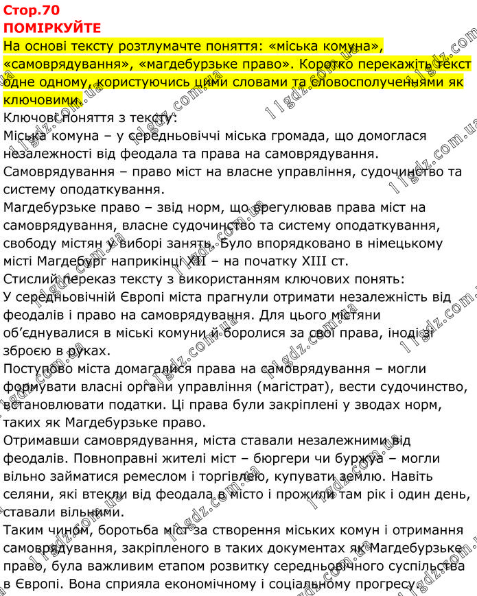 ПОМІРКУЙТЕ На основі тексту розтлумачте поняття: «міська комуна», «самоврядування», «магдебурзьке право». Коротко перекажіть текст одне одному, користуючись цими словами та словосполученнями як ключовими. Ключові поняття з тексту: Міська комуна – у середньовіччі міська громада, що домоглася незалежності від феодала та права на самоврядування. Самоврядування – право міст на власне управління, судочинство та систему оподаткування. Магдебурзьке право – звід норм, що врегулював права міст на самоврядування, власне судочинство та систему оподаткування, свободу містян у виборі занять. Було впорядковано в німецькому місті Магдебург наприкінці XII – на початку XIII ст. Стислий переказ тексту з використанням ключових понять: У середньовічній Європі міста прагнули отримати незалежність від феодалів і право на самоврядування. Для цього містяни об’єднувалися в міські комуни й боролися за свої права, іноді зі зброєю в руках. Поступово міста домагалися права на самоврядування – могли формувати власні органи управління (магістрат), вести судочинство, встановлювати податки. Ці права були закріплені у зводах норм, таких як Магдебурзьке право. Отримавши самоврядування, міста ставали незалежними від феодалів. Повноправні жителі міст – бюргери чи буржуа – могли вільно займатися ремеслом і торгівлею, купувати землю. Навіть селяни, які втекли від феодала в місто і прожили там рік і один день, ставали вільними. Таким чином, боротьба міст за створення міських комун і отримання самоврядування, закріпленого в таких документах як Магдебурзьке право, була важливим етапом розвитку середньовічного суспільства в Європі. Вона сприяла економічному і соціальному прогресу.