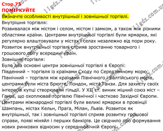 ПОМІРКУЙТЕ Визначте особливості внутрішньої і зовнішньої торгівлі. Внутрішня торгівля: Розвивалася між містом і селом, містом і замком, а також між різними областями країни. Центрами внутрішньої торгівлі були ярмарки, які регулярно влаштовували у містах і селах незалежно від пори року. Розвиток внутрішньої торгівлі сприяв зростанню товарного і грошового обігу всередині країн. Зовнішня торгівля: Було два основні центри зовнішньої торгівлі в Європі: Південний – торгівля із країнами Сходу по Середземному морю; Північний – торгівля між країнами Північного і Балтійського морів, центрами були міста Брюгге, Лондон, міста Ганзи. Для захисту своїх інтересів купці створювали гільдії. У XII ст. виник міцний союз міст – Ганза, що охоплював торгівлю Північної і частково Західної Європи. Центрами міжнародної торгівлі були великі ярмарки в провінції Шампань, містах Кельн, Прага, Мілан, Львів. Розвиток як внутрішньої, так і зовнішньої торгівлі сприяв розвитку грошової справи, появі міняйл і перших банкірів. Це свідчило про формування нових ринкових відносин у середньовічній Європі.