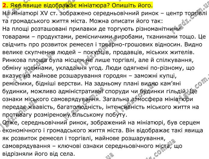Яке явище відображає мініатюра? Опишіть його. На мініатюрі XV ст. зображено середньовічний ринок – центр торгівлі та громадського життя міста. Можна описати його так: На площі розташовані прилавки де торгують різноманітними товарами – продуктами, ремісничими виробами, тканинами тощо. Це свідчить про розвиток ремесел і товарно-грошових відносин. Видно велике скупчення людей – покупців, продавців, міських жителів. Ринкова площа була місцем не лише торгівлі, але й спілкування, обміну новинами, укладання угод. Люди одягнені по-різному, що вказує на майнове розшарування городян – заможні купці, ремісники, бідніші верстви. На задньому плані видно кам’яні будинки, можливо адміністративні споруди чи будинки гільдій. Це ознаки міського самоврядування. Загальна атмосфера мініатюри передає жвавість, багатолюдність, інтенсивність міського життя на противагу розміреному сільському побуту. Отже, середньовічний ринок, зображений на мініатюрі, був серцем економічного і громадського життя міста. Він відображає такі явища як розвиток ремесел і торгівлі, майнове розшарування, самоврядування – ключові ознаки середньовічного міста, що відрізняли його від села.