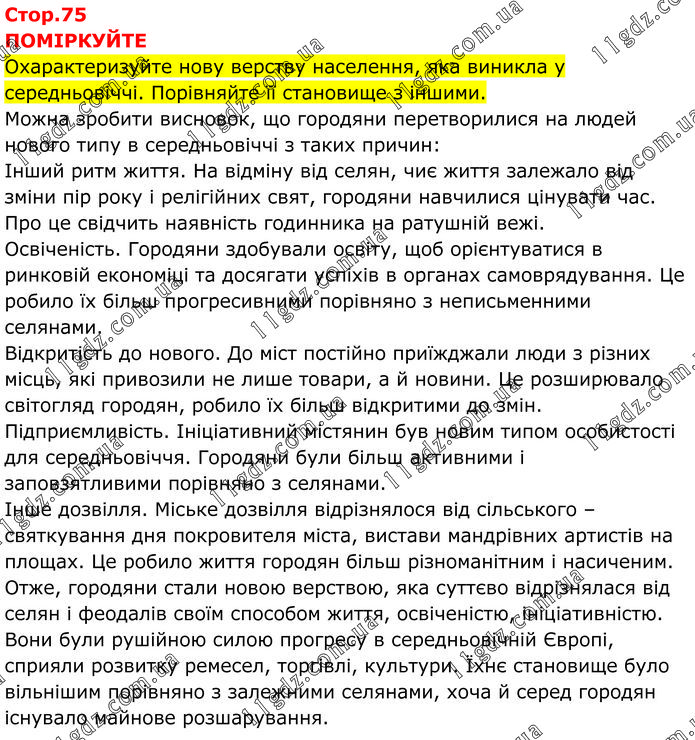 ПОМІРКУЙТЕ Охарактеризуйте нову верству населення, яка виникла у середньовіччі. Порівняйте її становище з іншими. Можна зробити висновок, що городяни перетворилися на людей нового типу в середньовіччі з таких причин: Інший ритм життя. На відміну від селян, чиє життя залежало від зміни пір року і релігійних свят, городяни навчилися цінувати час. Про це свідчить наявність годинника на ратушній вежі. Освіченість. Городяни здобували освіту, щоб орієнтуватися в ринковій економіці та досягати успіхів в органах самоврядування. Це робило їх більш прогресивними порівняно з неписьменними селянами. Відкритість до нового. До міст постійно приїжджали люди з різних місць, які привозили не лише товари, а й новини. Це розширювало світогляд городян, робило їх більш відкритими до змін. Підприємливість. Ініціативний містянин був новим типом особистості для середньовіччя. Городяни були більш активними і заповзятливими порівняно з селянами. Інше дозвілля. Міське дозвілля відрізнялося від сільського – святкування дня покровителя міста, вистави мандрівних артистів на площах. Це робило життя городян більш різноманітним і насиченим. Отже, городяни стали новою верствою, яка суттєво відрізнялася від селян і феодалів своїм способом життя, освіченістю, ініціативністю. Вони були рушійною силою прогресу в середньовічній Європі, сприяли розвитку ремесел, торгівлі, культури. Їхнє становище було вільнішим порівняно з залежними селянами, хоча й серед городян існувало майнове розшарування.