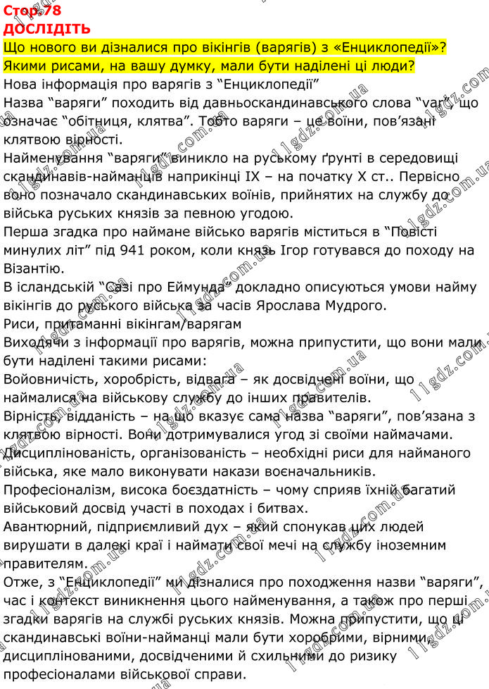 ДОСЛІДІТЬ Що нового ви дізналися про вікінгів (варягів) з «Енциклопедії»? Якими рисами, на вашу думку, мали бути наділені ці люди? Нова інформація про варягів з “Енциклопедії” Назва “варяги” походить від давньоскандинавського слова “var”, що означає “обітниця, клятва”. Тобто варяги – це воїни, пов’язані клятвою вірності. Найменування “варяги” виникло на руському ґрунті в середовищі скандинавів-найманців наприкінці IX – на початку X ст.. Первісно воно позначало скандинавських воїнів, прийнятих на службу до війська руських князів за певною угодою. Перша згадка про наймане військо варягів міститься в “Повісті минулих літ” під 941 роком, коли князь Ігор готувався до походу на Візантію. В ісландській “Сазі про Еймунда” докладно описуються умови найму вікінгів до руського війська за часів Ярослава Мудрого. Риси, притаманні вікінгам/варягам Виходячи з інформації про варягів, можна припустити, що вони мали бути наділені такими рисами: Войовничість, хоробрість, відвага – як досвідчені воїни, що наймалися на військову службу до інших правителів. Вірність, відданість – на що вказує сама назва “варяги”, пов’язана з клятвою вірності. Вони дотримувалися угод зі своїми наймачами. Дисциплінованість, організованість – необхідні риси для найманого війська, яке мало виконувати накази воєначальників. Професіоналізм, висока боєздатність – чому сприяв їхній багатий військовий досвід участі в походах і битвах. Авантюрний, підприємливий дух – який спонукав цих людей вирушати в далекі краї і наймати свої мечі на службу іноземним правителям. Отже, з “Енциклопедії” ми дізналися про походження назви “варяги”, час і контекст виникнення цього найменування, а також про перші згадки варягів на службі руських князів. Можна припустити, що ці скандинавські воїни-найманці мали бути хоробрими, вірними, дисциплінованими, досвідченими й схильними до ризику професіоналами військової справи.