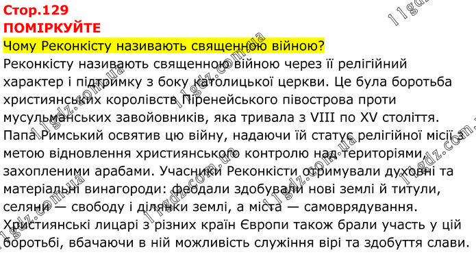 ПОМІРКУЙТЕ Чому Реконкісту називають священною війною? Реконкісту називають священною війною через її релігійний характер і підтримку з боку католицької церкви. Це була боротьба християнських королівств Піренейського півострова проти мусульманських завойовників, яка тривала з VIII по XV століття. Папа Римський освятив цю війну, надаючи їй статус релігійної місії з метою відновлення християнського контролю над територіями, захопленими арабами. Учасники Реконкісти отримували духовні та матеріальні винагороди: феодали здобували нові землі й титули, селяни — свободу і ділянки землі, а міста — самоврядування. Християнські лицарі з різних країн Європи також брали участь у цій боротьбі, вбачаючи в ній можливість служіння вірі та здобуття слави.